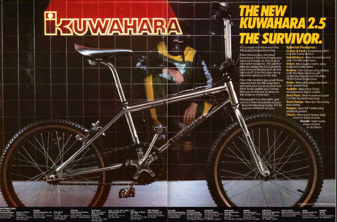 KZ-1 The KZ-1 was built with a lightweight and tough Cro-Moly frame and fork with components from SunTour, Dia-Compe, Ukai and Taihei. The KZ-1 and KZ-2 frame and fork were the same with the exception of a few small components (Crank, pedals and stem) The ET model was different that the KZ-1 and KZ-2. (ET model used a loop tail with the KZ double gussets) Components Frame and Fork: Cro-Moly Bars: Redline V-bar Grips: OGK Stem: SunTour Wheels: Ukai Hubs: SunTour (Large flange open bearings) Crank: SunTour V/X crank 170mm Pedals: KKT Lightning alloy pedals (KKT FMX) Seat: Taihei Elina Nylon seat Seat post: Fluted Alloy (Nagaoka) Seat clamp: SunTour Brakes: Dia-Compe MX1000. FIRST DIGIT: K represents a KZ Kuwahara BMX. Early frames are stamped with a T mark for Tange. Above example shows letter K for Kuwahara KZ SECOND DIGIT: This is a number and not a letter.
